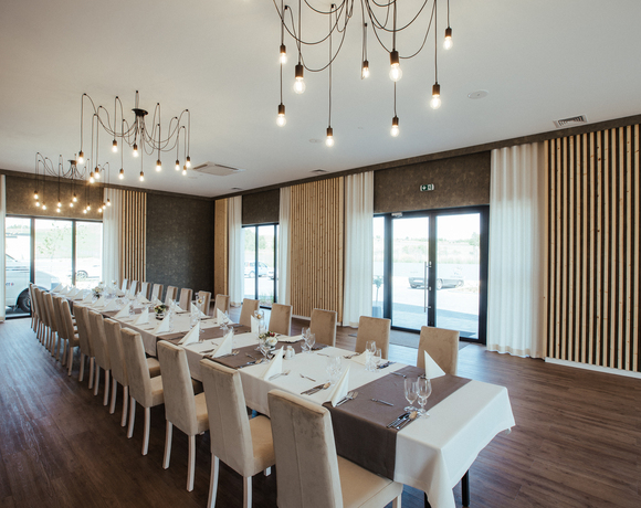 Urokliwa przestrzeń doskonała na małe i średnie przyjęcia oraz rodzinne uroczystości. Duże przeszklenia nadają atmosferę pełną ciepła i elegancji sprawią, że każda chwila będzie niezapomniana. Sala dla 55 osób z parkietem do zabawy.