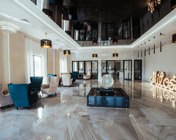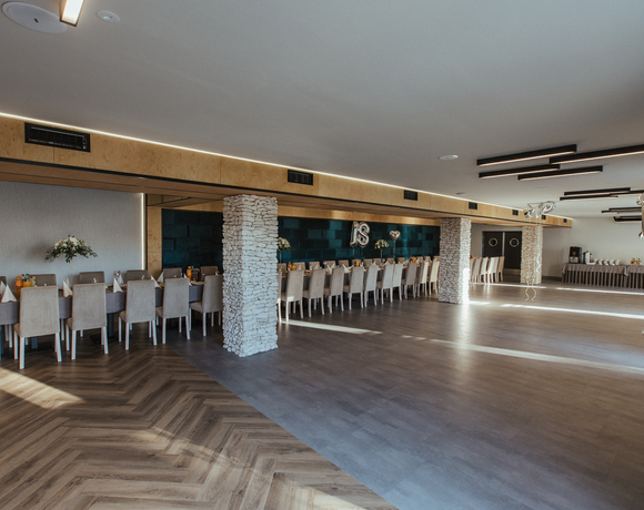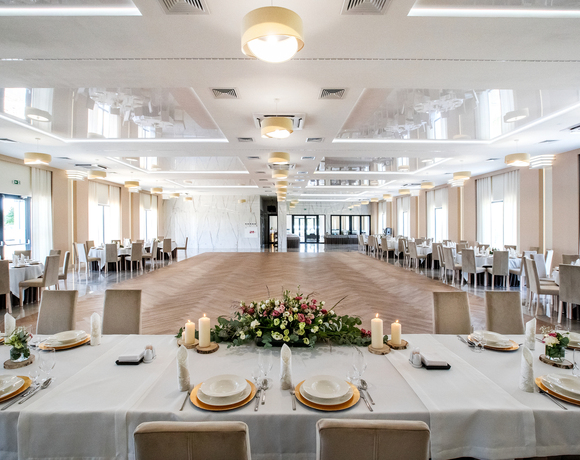 Urzeka elegancją, beżowa kolorystyka nadaje jej subtelny i klasyczny charakter, wysoki sufit z centralnymi lampami oraz dodatkowym oświetleniem LED, które można dostosować do różnych nastrojów i potrzeb imprezy. Subtelne, boczne oświetlenie LED dodaje wnętrzu przytulność i ciepło. Eleganckie beżowe zasłony z jedwabnego materiału, które opadają wzdłuż wysokich okien zdecydowanie dopełniają wygląd całej sali. Drewnianym parkietem w jasnym odcieniu, który idealnie komponuje się z beżową kolorystyką sali. Dzięki braku filarów, sala oferuje otwartą i przestronną przestrzeń, która pozwala na swobodne poruszanie się i tańce. Jest to idealne miejsce na organizację dużych przyjęć, wesel czy balów, gdzie goście mogą cieszyć się nieograniczoną przestrzenią. Sala dla 180 osób w połączeniu z sala Fontannową przestrzeń pomieści 300 osób. Istnieje możliwość podziału Sali balowej na 5 modułów każdy dla 35 osób.